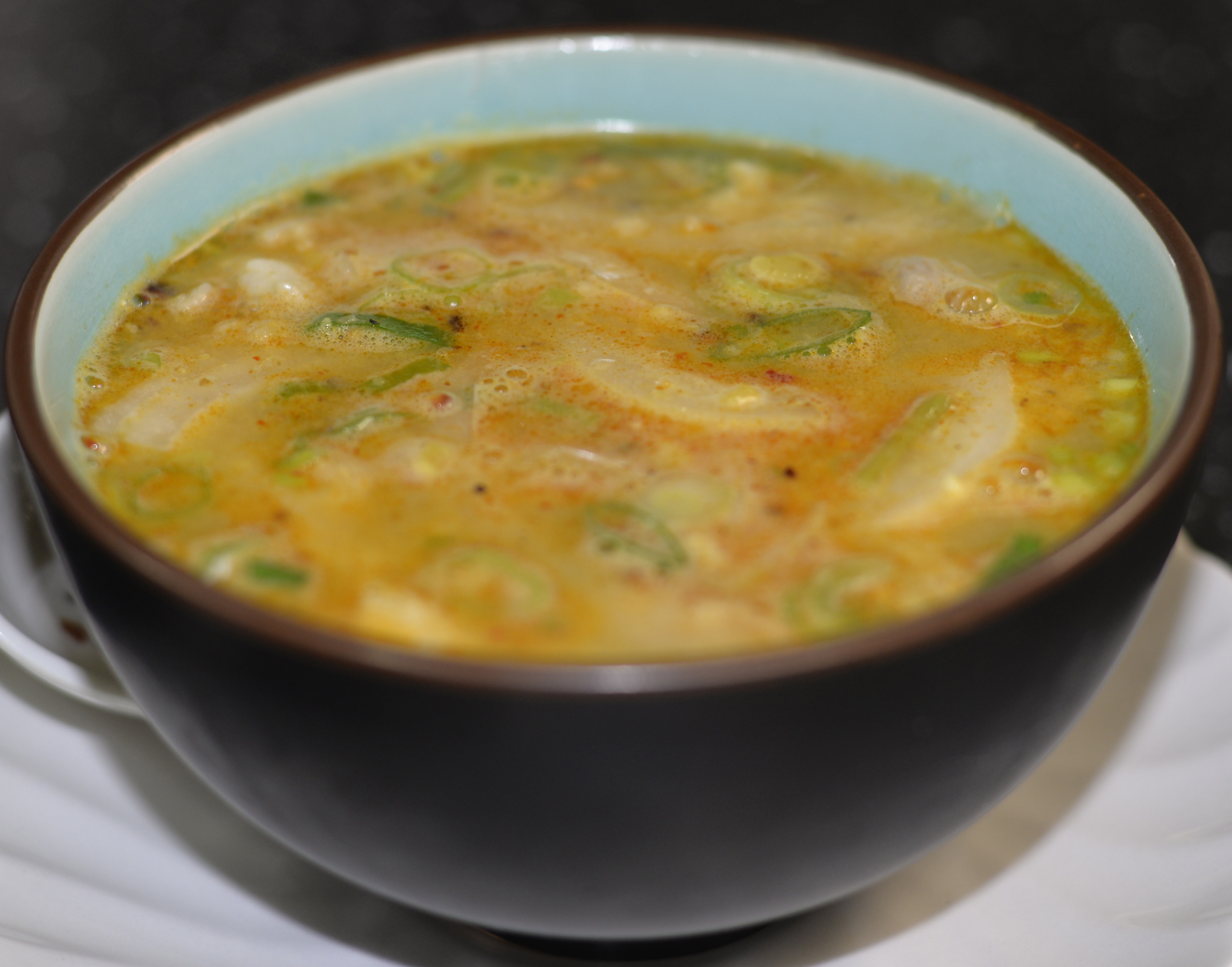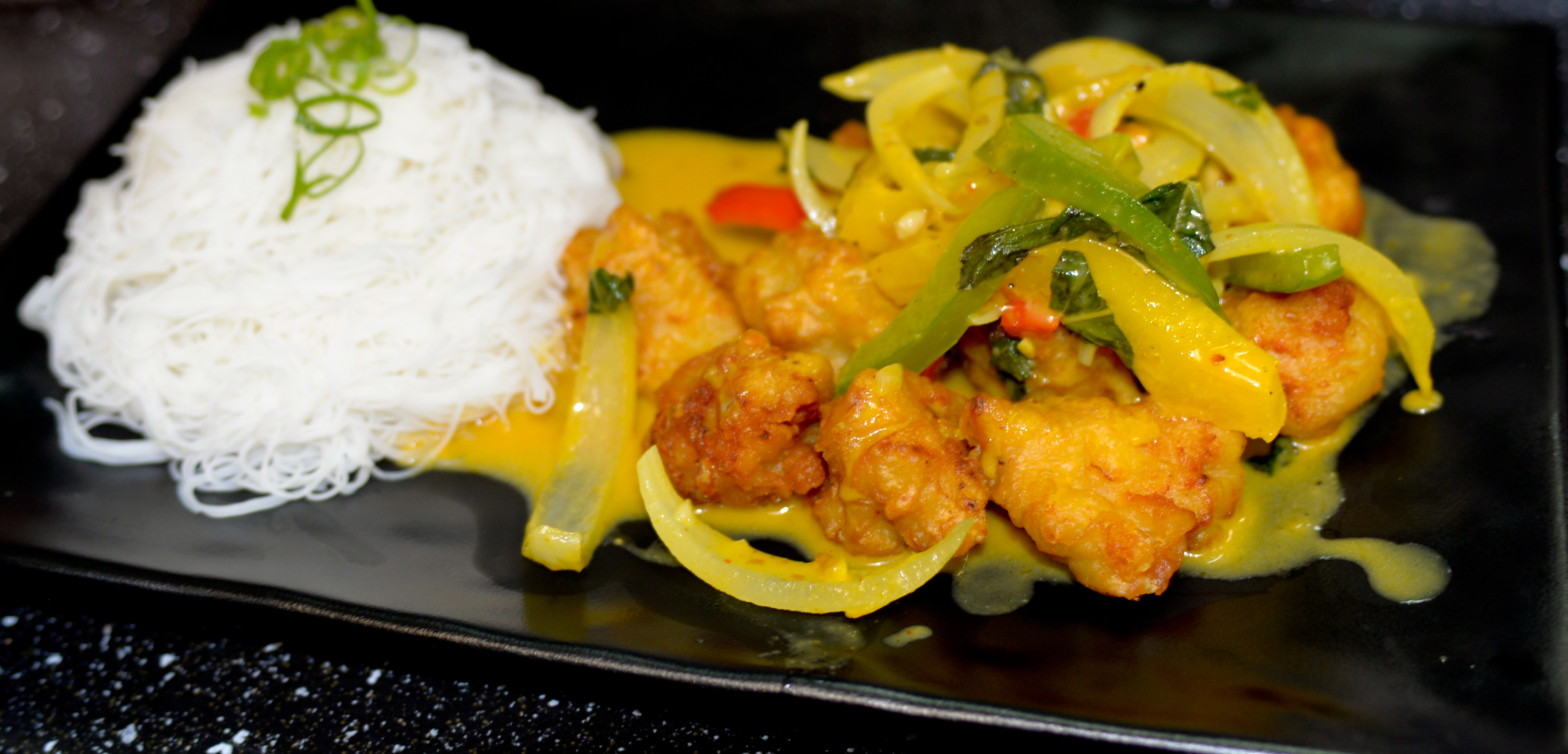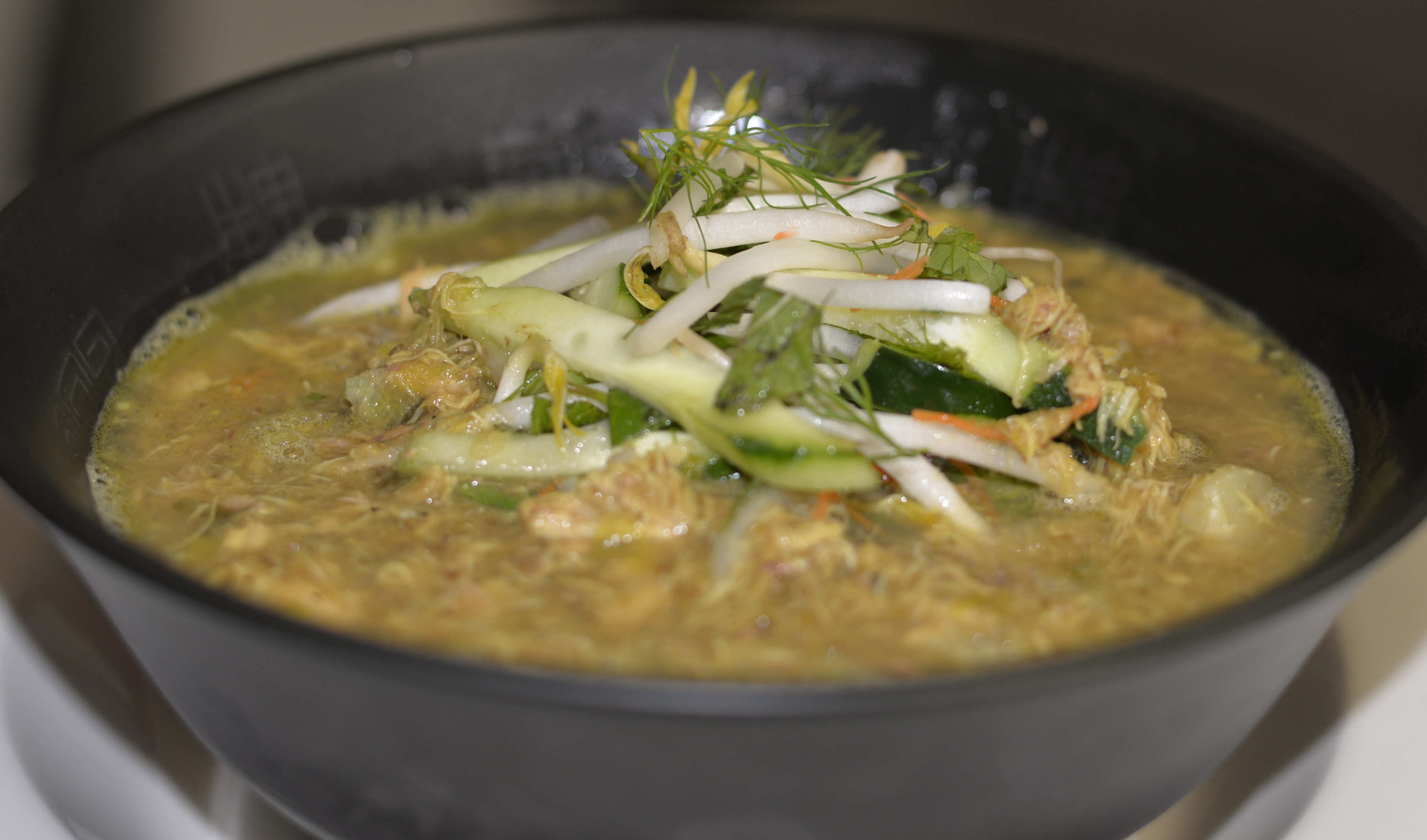 Soupe de cari au lait de coco, vermicelle de riz,zeste de citron & oignons